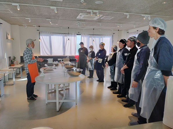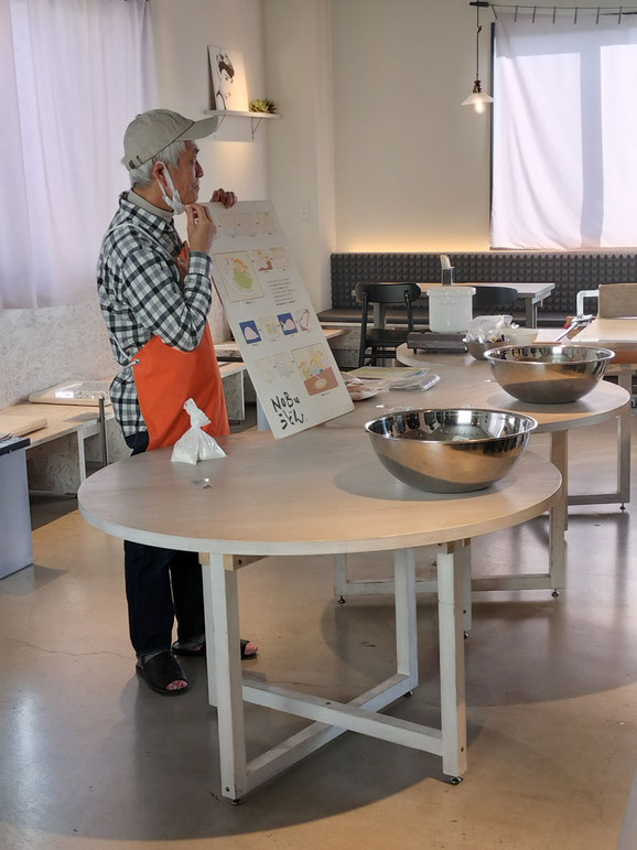 外部から、手打ちうどん講師の「のぶさん」をお招きし、材料の説明から、うどんが出来るまでの流れ、そして手打ちうどん作り体験の講習をして頂きました。
