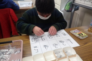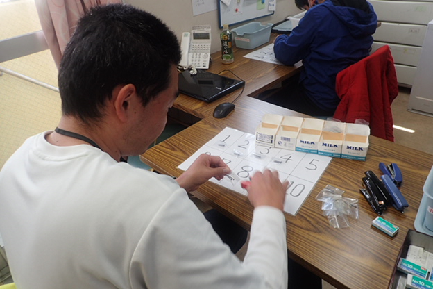 A. 5名で作業をしています。1~10までの数字を書いたシートと、牛乳パックで作った10マスのケースを活用しています。数字を書いたシートの上で作業をし、袋詰めしたネジ10セットができたら牛乳パックのケースに入れます。1マスに10個ずつ入れていき、10マス目まで入れると100袋分が完成するので、次に入数チェックの工程に回し、チェックが終わると大きな袋に詰めて、100袋が完成します。